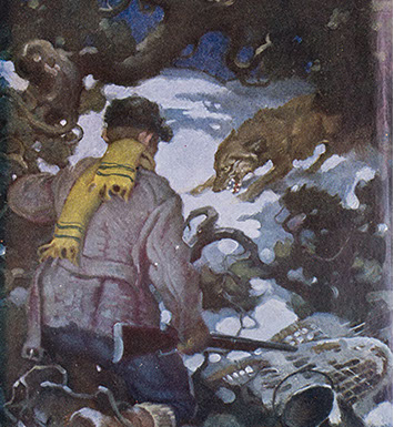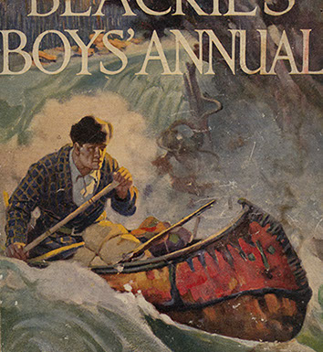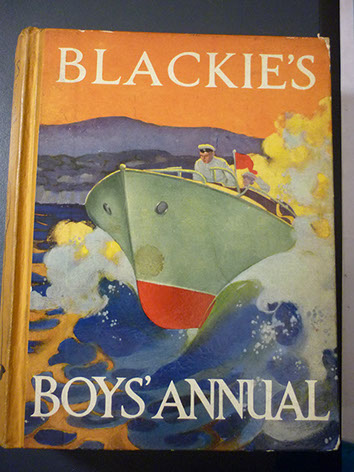 Books for children also developed rapidly after the war. Gone was Victorian conformity, with the dreadful shadow of the duty which had led so many to their deaths in the trenches. Instead, individuality, courage and ingenuity were to the fore. Having drawn the cover for Blackie’s Boys Annual in 1925, Mackinlay kept the honour for the two succeeding years. He started by providing two nail-biting action scenes in 1925 and 1926, then used intense colour and careful placement on the page in 1927, understanding that suspense could be as important an incentive to the would-be purchaser as all-out drama.