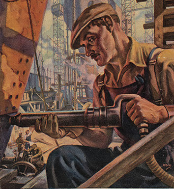 "The Riveter – specially painted for John Bull by M. Mackinlay – is a skilled man; a craftsman round whom a controversy rages”