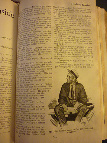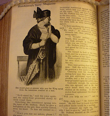 “She would glare at anyone who saw the King saved from the luxurious comfort of a seat.”, from Herbert Jenkins’ Mr Stiffson’s Seaside Adventure in Hutchinson's Story Magazine, Oct. 1920, p. 346, 23 x 14.8cms