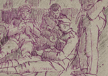 Drawing was the foundation of everything Mackinlay did as an artist. His sketches show that he drew with great fluency, rarely hesitating, with the ability to simplify, and make the greatest impact with the fewest strokes. He was a true all-rounder, able to record figures at rest and in action. In his magazine illustrations, the use of unusual angles, a figure seen from behind, from above, from below, all heighten the dramatic tension of the incident depicted. Sometimes these were sketched from a model (usually one of his family), but in many cases Mackinlay relied on memory or imagination.