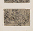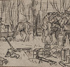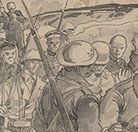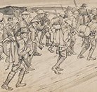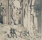 Many of his drawings have the look of finished compositions, though they must have been made in haste in the most difficult circumstances. His scenes of camp life, of advancing troops in ruined buildings, and the taking of German prisoners are intensely vivid. Even when he was wounded, Mackinlay continued to draw, in the Casualty Clearing Station in France, then in the military hospital at Netley, near Southampton, where he was sent to recuperate. Even though this work found no outlet in publication or any official commission, these early drawings offer ample evidence of Mackinlay’s humanity, his insatiable appetite to exercise his craft and the imaginative capacity to seize the ‘significant moment’, all of which he would soon put to use in his work as an illustrator.