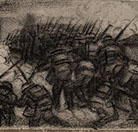 At the outbreak of war in August 1914, Mackinlay was just 20 years old. In London, there was no possibility for him to sign up for the Australian forces, and he opted to continue his studies. He enrolled at St Martin’s School of Art until, following the introduction of conscription, he was called up by the British army in autumn 1917. A private in the Suffolk Regiment, he was deployed to Belgium in March 1918; a few weeks later, after they suffered heavy losses at Arras in France, he was reassigned to the South Staffordshire Regiment. Like several British artists who served in the regular army before the expansion of the official War Artists’ Scheme in 1918, such as William Roberts (1895-1980) and Stanley Spencer (1891-1959), Mackinlay witnessed the battlefield from the inside. He used his pencils and brushes at every available opportunity, not just during the lulls in the fighting and in the protracted periods of inactivity.