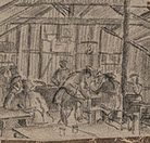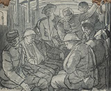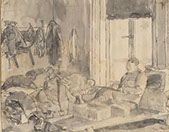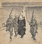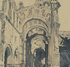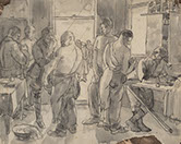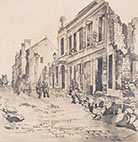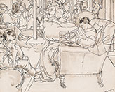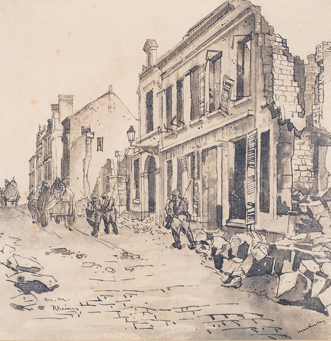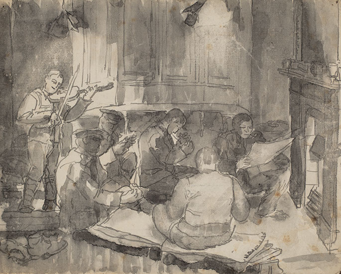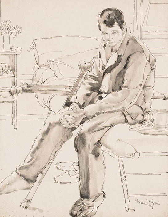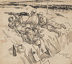 Many of his drawings have the look of finished compositions, though they must have been made in haste in the most difficult circumstances. His scenes of camp life, of advancing troops in ruined buildings, and the taking of German prisoners are intensely vivid. Even when he was wounded, Mackinlay continued to draw, in the Casualty Clearing Station in France, then in the military hospital at Netley, near Southampton, where he was sent to recuperate. Even though this work found no outlet in publication or any official commission, these early drawings offer ample evidence of Mackinlay’s humanity, his insatiable appetite to exercise his craft and the imaginative capacity to seize the ‘significant moment’, all of which he would soon put to use in his work as an illustrator.