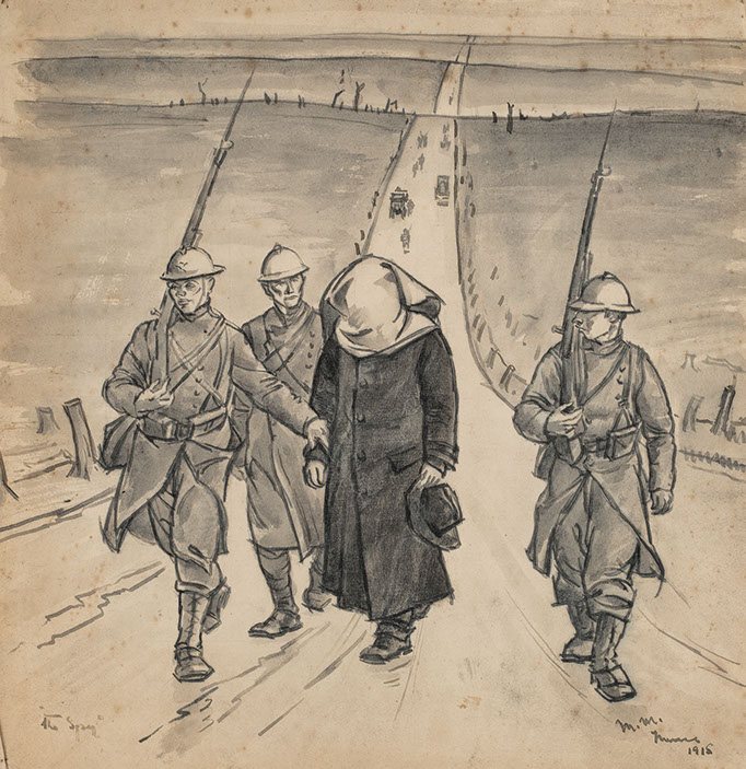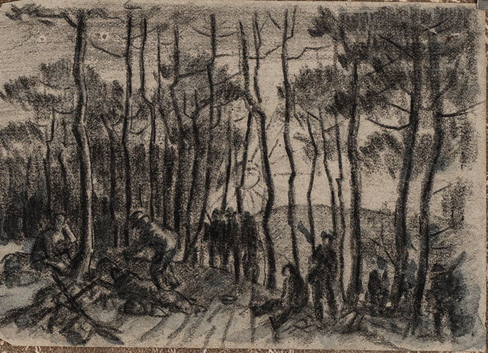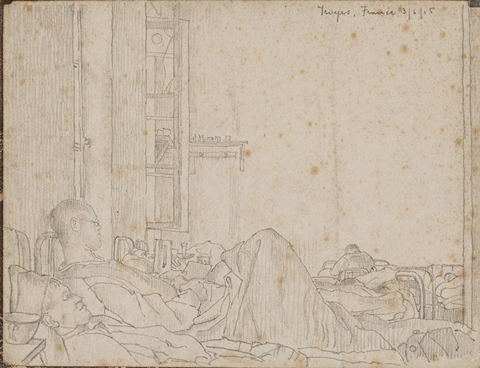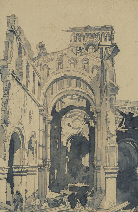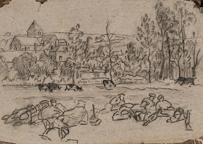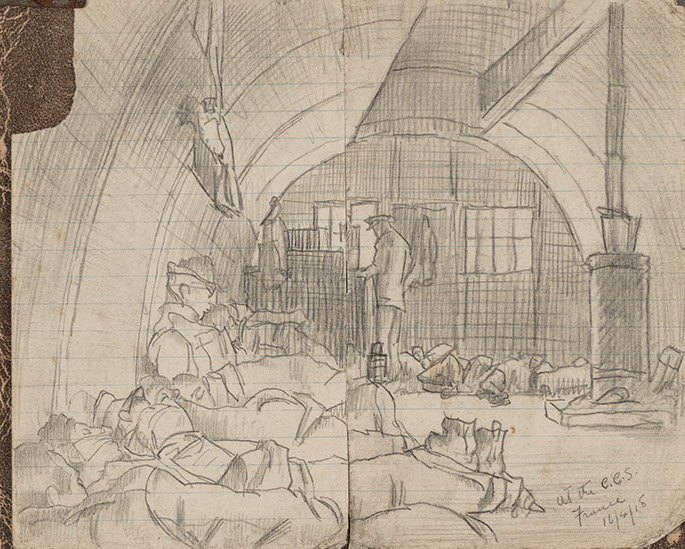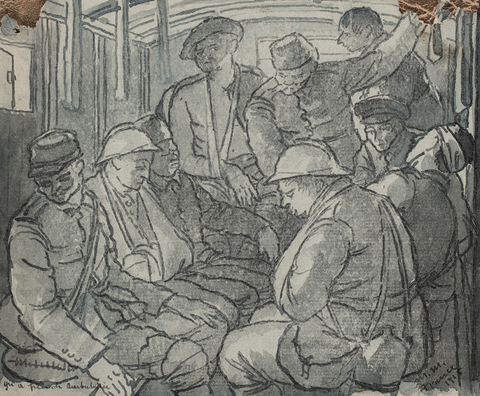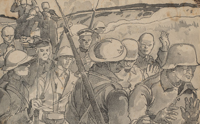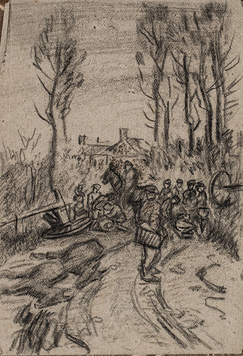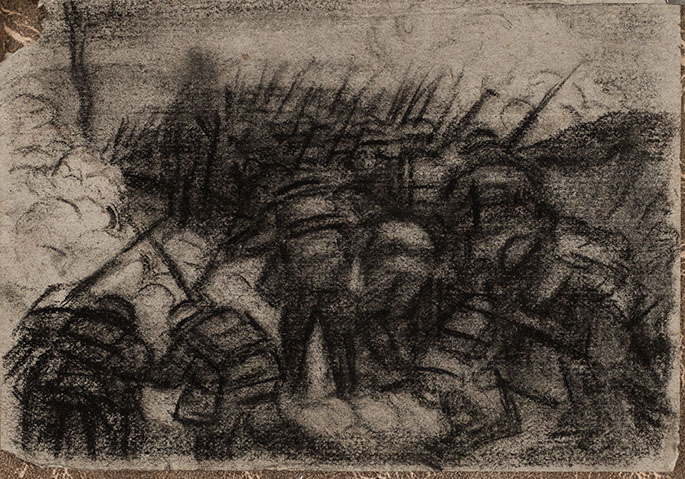 At the outbreak of war in August 1914, Mackinlay was just 20 years old. In London, there was no possibility for him to sign up for the Australian forces, and he opted to continue his studies. He enrolled at St Martin’s School of Art until, following the introduction of conscription, he was called up by the British army in autumn 1917. A private in the Suffolk Regiment, he was deployed to Belgium in March 1918; a few weeks later, after they suffered heavy losses at Arras in France, he was reassigned to the South Staffordshire Regiment. Like several British artists who served in the regular army before the expansion of the official War Artists’ Scheme in 1918, such as William Roberts (1895-1980) and Stanley Spencer (1891-1959), Mackinlay witnessed the battlefield from the inside. He used his pencils and brushes at every available opportunity, not just during the lulls in the fighting and in the protracted periods of inactivity.